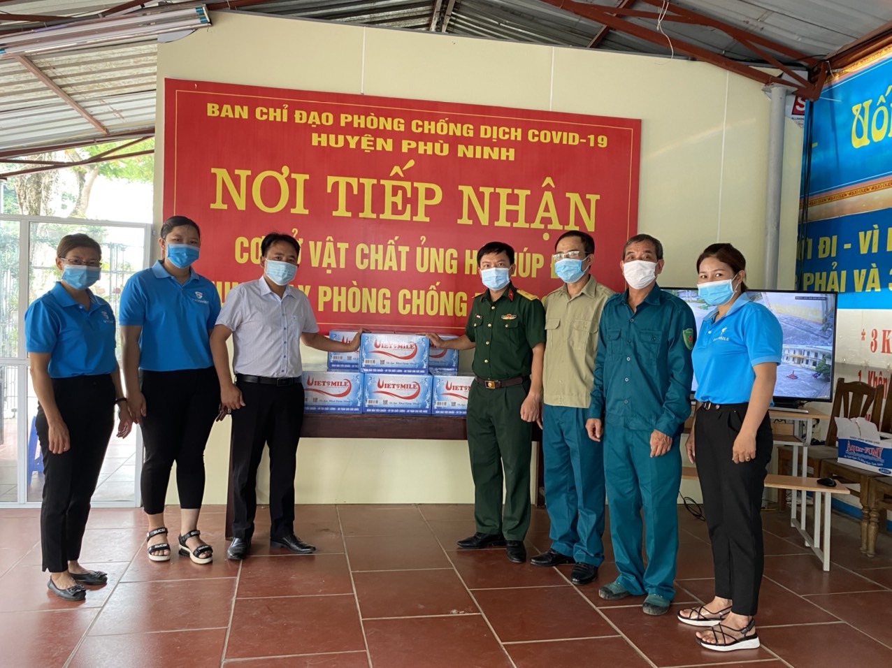 Phía công ty Vietsmile gồm có Ông Trần Quang Vinh - Giám đốc kinh doanh khu vực phía bắc đại diện trao nước hỗ trợ các chiến sĩ tại địa phương để tiếp thêm động lực cùng các chiến sĩ vượt qua đại dịch covid-19 đang có nguy cơ bùng phát tại địa phương.